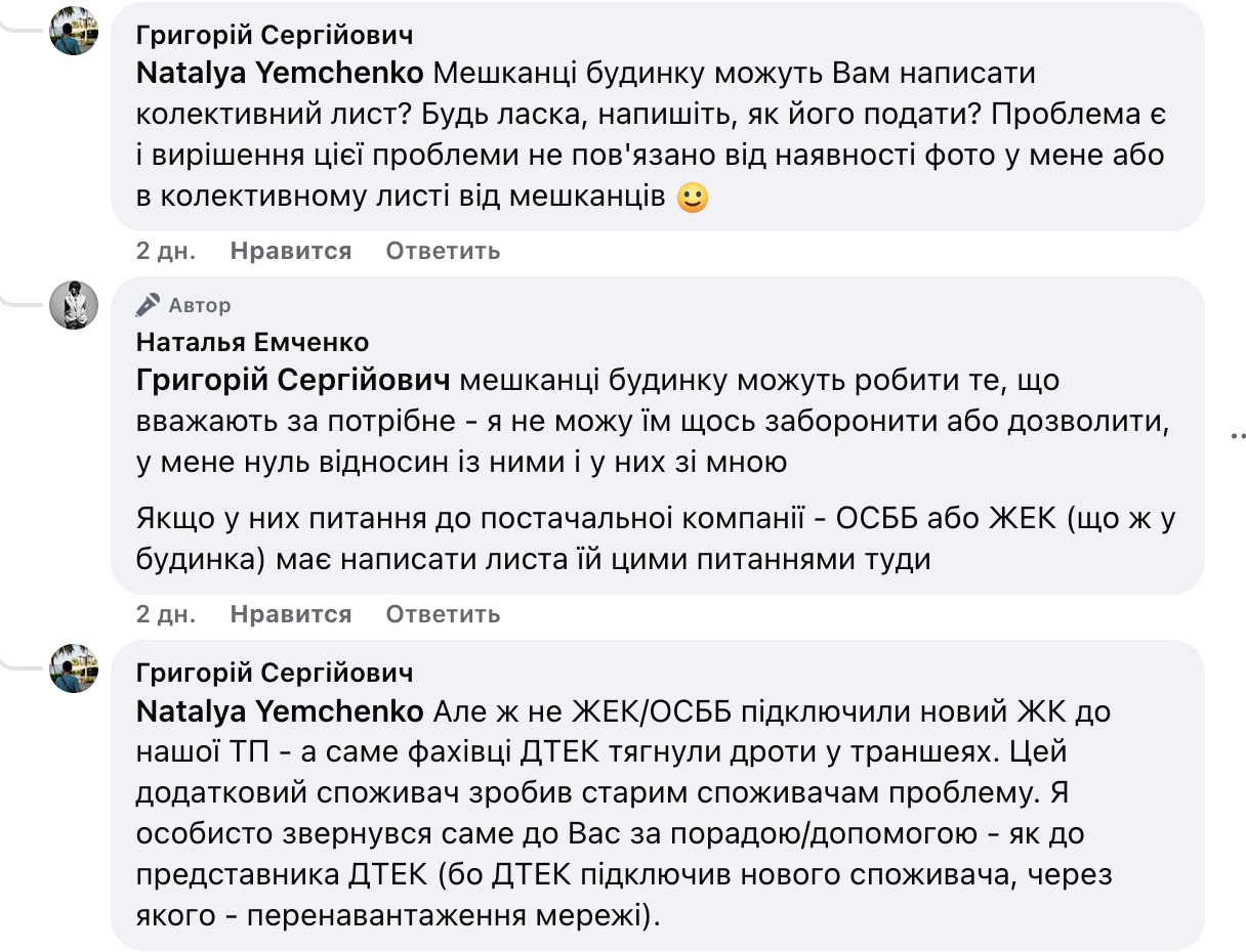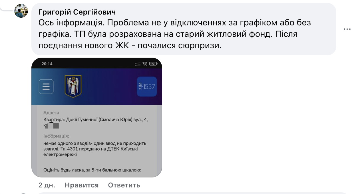 Під одним із постів Ємченко про відключення світла користувач Facebook запитав про конкретну проблему з електропостачанням у Голосіївському районі Києва. За його словами, у будинку на вулиці Докії Гуменної (Смолича Юрія) перевантажена мережа через відключення новобудови.