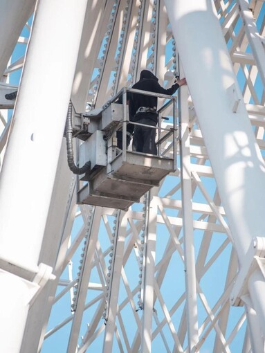На Контрактовій площі в Києві розпочали демонтаж оглядового колеса — атракціону, що простояв на Подолі майже вісім років. Роботи розпочав один із робітників, який знімав декоративну підсвітку з конструкцій — фото з місця поділилися користувачі в мережі Контрактова площа. За даними Київської міської прокуратури, ще у грудні 2025 року відомство домоглося заборони роботи атракціону через незадовільний стан несучих конструкцій.